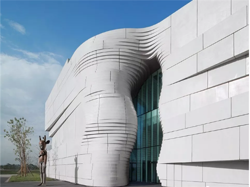 建筑立面设计大量采用不规则、无规律的线条来表现,艺术美术馆整体建筑呈长条状,为充分体现出横向的线条设计感,立面装饰的每块板的分格需要较大,GRC板是理想的替代材料,板块横向长度达到近4米,这是其他材料(如石材、水晶石、人造板等)无法做到的。